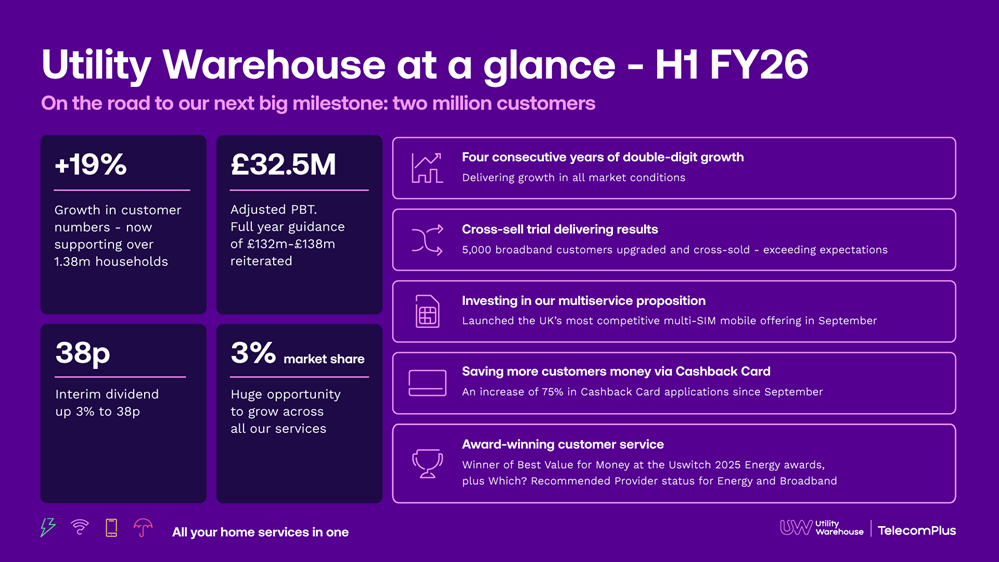 Telecom Plus trades under the name Utility Warehouse (UW), we are a unique UK multi-service provider with a purpose: to stop households wasting time and money on essential services. UW is the UK’s only genuine multiservice utility provider – offering customers energy, broadband, mobile and insurance – and is fully regulated by Ofgem, Ofcom and the Financial Conduct Authority.
